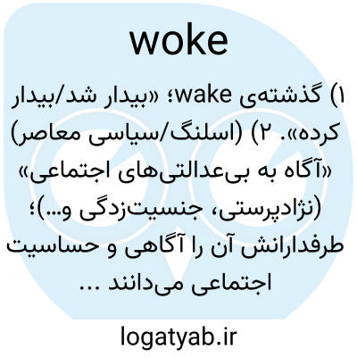 ۱) گذشته‌ی wake؛ «بیدار شد/بیدار کرده». ۲) (اسلنگ/سیاسی معاصر) «آگاه به بی‌عدالتی‌های اجتماعی» (نژادپرستی، جنسیت‌زدگی و…)؛ طرفدارانش آن را آگاهی و حساسیت اجتماعی می‌دانند و مخالفانش گاهی به‌صورت تحقیرآمیز برای «زیادی سیاسی‌درست بودن» به کار می‌برند.