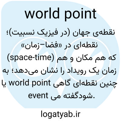 📌 (در نسبیت) نقطه‌ای در فضا-زمان، که با سه مختصات فضایی و یک مختصات زمانی مشخص می‌شود.