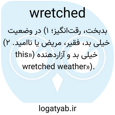 بدبخت، رقت‌انگیز؛ ۱) در وضعیت خیلی بد، فقیر، مریض یا ناامید. ۲) خیلی بد و آزاردهنده («this wretched weather»).