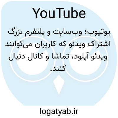 یوتیوب؛ وب‌سایت و پلتفرم بزرگ اشتراک ویدئو که کاربران می‌توانند ویدئو آپلود، تماشا و کانال دنبال کنند.