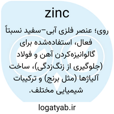 📌 شیمی.، یک عنصر فلزی انعطافپذیر و سفید مایل به آبی: در ساخت آهن گالوانیزه، برنج و سایر آلیاژها و به عنوان عنصری در سلولهای ولتایی استفاده میشود. روی؛ 65.37؛ 30؛ 7.14 در دمای 20 درجه سانتیگراد.