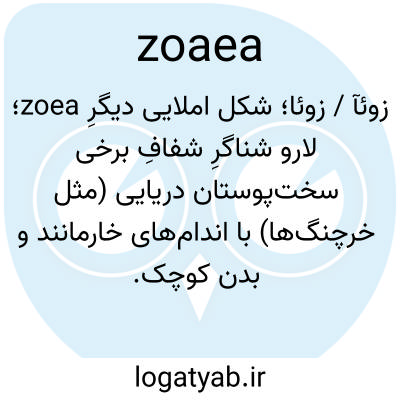 زوئآ / زوئا؛ شکل املایی دیگرِ zoea؛ لارو شناگرِ شفافِ برخی سخت‌پوستان دریایی (مثل خرچنگ‌ها) با اندام‌های خارمانند و بدن کوچک.