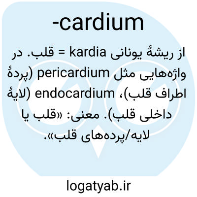 از ریشهٔ یونانی kardia = قلب. در واژه‌هایی مثل pericardium (پردهٔ اطراف قلب)، endocardium (لایهٔ داخلی قلب). معنی: «قلب یا لایه/پرده‌های قلب».