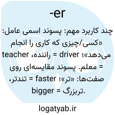 📌 پسوندی که به عنوان شکل سازهایِ اسمهای فاعل در زبان انگلیسی عمل میکند و به افعال از هر ریشهای (باربر؛ خزنده؛ کارفرما؛ دروگر؛ معلم؛ نظریهپرداز) میچسبد.