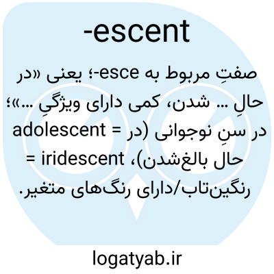 📌 پسوندی برای صفتها که از لاتین وام گرفته شده است، و در آن آغاز یک عمل یا فرآیند را بیان میکند؛ اغلب با افعالی که به -esce و اسمهایی که به -escence ختم میشوند، مطابقت دارد: نقاهت؛ بازگشتکننده.