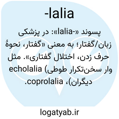 پسوند «-lalia»: در پزشکی زبان/گفتار؛ به معنی «گفتار، نحوهٔ حرف زدن، اختلال گفتاری». مثل echolalia (تکرار طوطی‌وار سخن دیگران)، coprolalia.