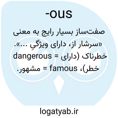 📌 پسوندی که صفتهایی را میسازد که معنای کلی «دارنده، سرشار از» یک کیفیت معین را دارند (طمعکار؛ باشکوه؛ عصبی؛ شگفتانگیز)؛ -ous و گونهی دیگر آن -ious اغلب برای انگلیسیسازی صفتهای لاتین با پایانهایی که نمیتوانند مستقیماً با انگلیسی تطبیق داده شوند (atrocious؛ contiguous؛ garrulous؛parent؛ stupendous) استفاده شدهاند. این پسوند به عنوان یک پسوند صفتساز با ارزش خنثی، مرتباً صفتهای یونانی و لاتین مشتق شده بدون پسوند از اسمها و افعال را انگلیسیسازی میکند. بسیاری از این ساختارها در انگلیسی، صورتهای ترکیبی مولد هستند، گاهی اوقات با یک صورت ترکیبی اسمی متناظر که پسوندی ندارد؛