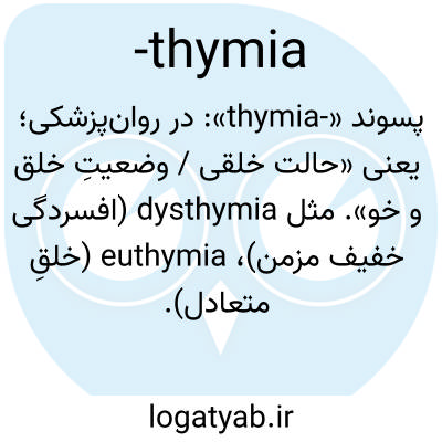 پسوند «-thymia»: در روان‌پزشکی؛ یعنی «حالت خلقی / وضعیتِ خلق و خو». مثل dysthymia (افسردگی خفیف مزمن)، euthymia (خلقِ متعادل).