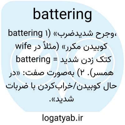 battering ۱) «ضربوجرح شدید، کوبیدن مکرر» (مثلاً در wife battering = کتک زدن شدید همسر). ۲) بهصورت صفت: «در حال کوبیدن/خرابکردن با ضربات شدید».