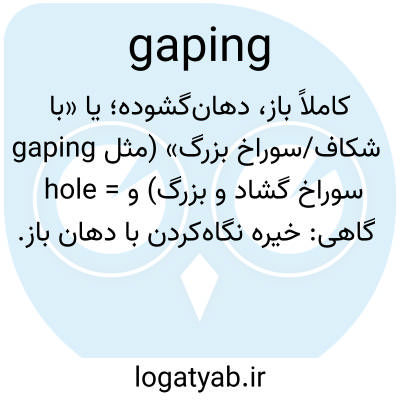 کاملاً باز، دهانگشوده؛ یا «با شکاف/سوراخ بزرگ» (مثل gaping hole = سوراخ گشاد و بزرگ) و گاهی: خیره نگاهکردن با دهان باز.