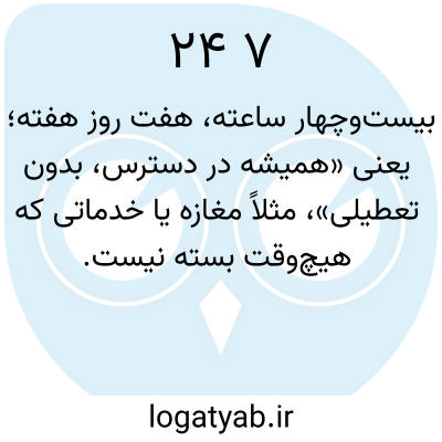 بیست‌وچهار ساعته، هفت روز هفته؛ یعنی «همیشه در دسترس، بدون تعطیلی»، مثلاً مغازه یا خدماتی که هیچ‌وقت بسته نیست.