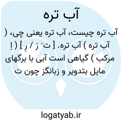 ( آب تره ) آب تره. [ ت َ رَ / رِ ] ( اِ مرکب ) گیاهی است آبی با برگهای مایل بتدویر و زبانگز چون ترتیزک و در چهارمحال اصفهان آن را بَکلو گویند، و آن از احرار بُقول است.، ابتره. [ اَ ت ِ رَ ] ( اِخ ) نام آبی بنی قشیر را.