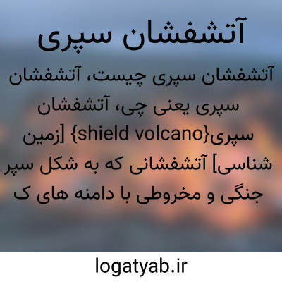 {shield volcano} [زمین شناسی] آتشفشانی که به شکل سپر جنگی و مخروطی با دامنه های کم شیب است