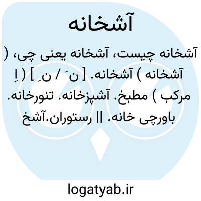 ( آشخانه ) آشخانه. [ ن َ / ن ِ ] ( اِ مرکب ) مطبخ. آشپزخانه. تنورخانه. باورچی خانه. || رستوران.