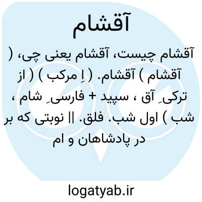 ( آقشام ) آقشام. ( اِ مرکب ) ( از ترکی ِ آق، سپید + فارسی ِ شام، شب ) اول شب. فلق. || نوبتی که بر در پادشاهان و امراء ترک زدندی شامگاهان. - آقشام زدن.