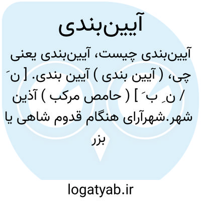 ( آیین بندی ) ( اسم ) آذین شهر شهر آرای هنگام قدوم شاهی یا بزرگی یا پیش آمدن جشن و سوری.