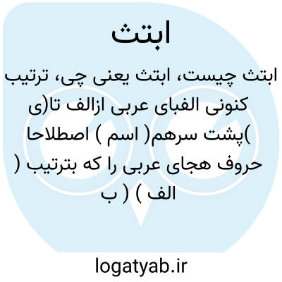 ( اسم ) اصطلاحا حروف هجای عربی را که بترتیب ( الف ) ( ب ) ( ت ) ( ث ) مرتب شده و به ( ی ) ختم میشود ( ابتث ) نامند مقابل ( ابجد ) و ترتیب آنها از این قرار است: ا ب ت ث ج ح خ د ذ ر ز س ش ص ض ط ظ ع غ ف ق ک ل م ن و ه ی. ایرانیان درین میان حروف ذیل را افزودهاند: ( پ ) بین ( ب ) و ( ت ) ( چ ) بین ( ج ) و ( ح ) ( ژ ) بین ( ز ) و ( س ) ( گ ) بین ( ک ) و ( ل ).
