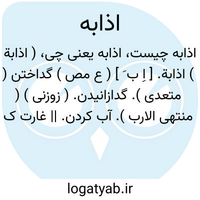 ( اذابة ) اذابة. [ اِ ب َ ] ( ع مص ) گداختن ( متعدی ). گدازانیدن. ( زوزنی ) ( منتهی الارب ). آب کردن. || غارت کردن. ( منتهی الارب ). || اذابه امر خویش؛ نیکو کردن کار خود را. ( منتهی الارب ).