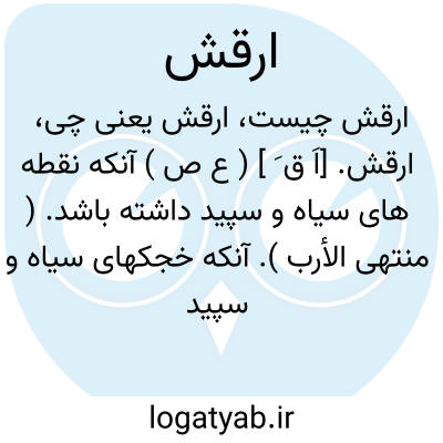 ارقش. [اَ ق َ ] ( ع ص ) آنکه نقطه های سیاه و سپید داشته باشد. ( منتهی الأرب ). آنکه خجکهای سیاه و سپید دارد. دارای خالهای سیاه و سپید. باخطوخال. ج، رُقش. || ماری که خطهای سرخ و سیاه و خاکی دارد. مار سیاه و سپید. ( مهذب الاسماء ). ارقم. مار پیسه. || اسبی که نقطه های خرد دارد مخالف رنگ وی. ارقط.