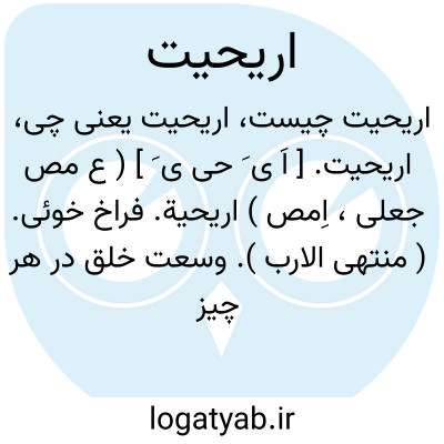 اریحیت. [ اَ ی َ حی ی َ ] ( ع مص جعلی، اِمص ) اریحیة. فراخ خوئی. ( منتهی الارب ). وسعت خلق در هر چیز و خصوصاً در کرم: سلطان دراکرام قدر و تبجیل محل او آثار اریحیت بجا آورد و او را باعزاز در بر گرفت. ( ترجمه تاریخ یمینی ص 251 ). و سلطان در قبول پیغام او و اکرام رسول و تحقیق مأمول آثار اریحیت طبع و انوار کرم سجیت و طهارت محتد و نزاهت عنصر کریم خویش ظاهر گردانید. ( ترجمه تاریخ یمینی ص 229 ). از آنجا که اریحیت طبع و کرم نهاد آن پادشاه بود، این دعوت را اجابت کرده باسعاف طلبت وانجاح حاجت او زبان داد. ( ترجمه تاریخ یمینی ص 28 ). || شادمانی. ( منتهی الارب ). نشاط: مقدم مواکب سلطانی را بهزّتی و اریحیتی که آثار آن بر جبین احوال او مشاهده می توانست نمود، استقبال کرد. ( جهانگشای جوینی ). || خوشدلی که بدهش و احسان کردن حاصل شود. ( منتهی الارب ). شادی که در بخشایش و جود رو دهد. ( آنندراج ). || عطا.