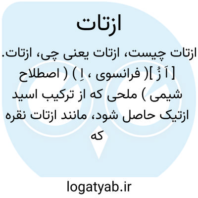 (اَ زُ ) [ فر. ] (اِ. ) ازتات ها یا نیترات ها، نمک های جامد اسید ازتیک هستند. بعضی بی رنگ یا سفید و برخی رنگین اند. مانند نیترات نیکل و مس. همة آن ها در آب حل می شوند و بر اثر حرارت تجزیه شده اکسیژن خود را از دست می دهند.
