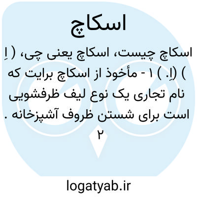 ( اِ ) (اِ. ) ۱ - مأخوذ از اسکاچ برایت که نام تجاری یک نوع لیف ظرفشویی است برای شستن ظروف آشپزخانه. ۲ - مأخوذ از نام اسکاچ که نام تجارتی نوعی چسب است. نوار چسب بی رنگ. ۳ - نوعی ویسکی. ۴ - پارچة چهارخانه: دامن اسکاچ.