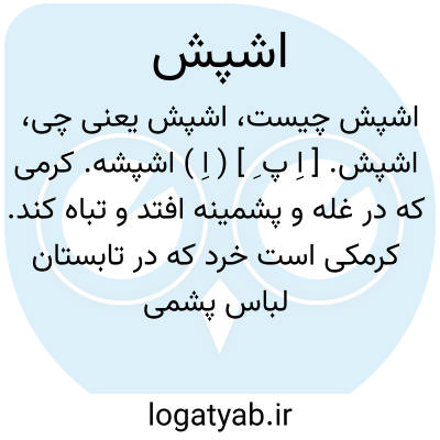 اشپش. [ اِ پ ِ ] ( اِ ) اشپشه. کرمی که در غله و پشمینه افتد و تباه کند. کرمکی است خرد که در تابستان لباس پشمینه را ضایع کند و در جو و گندم نیز باشد. ( انجمن آرای ناصری ) ( جهانگیری ). اشپشه کرمکی باشد که بیشتر در تابستان و هوای گرم در پوستین و نمد و سقرلاط و صوف و دیگر پشمینه ها و گندم و جو و دیگر غله ها افتد و ضایع کند. ( برهان قاطع ). سوس. بید.