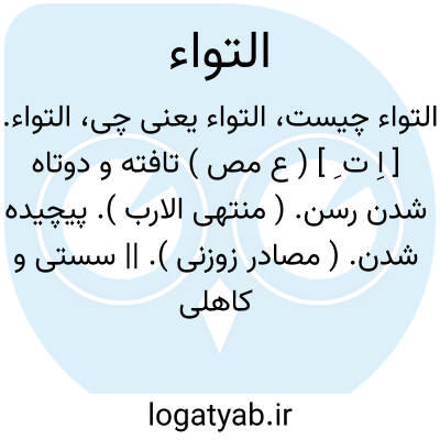 التواء. [ اِ ت ِ ] ( ع مص ) تافته و دوتاه شدن رسن. ( منتهی الارب ). پیچیده شدن. ( مصادر زوزنی ). || سستی و کاهلی کردن در کار. || کج گشتن ریگ. ( منتهی الارب ). لوی القدح و الرمل از باب فرح لوی بکسر اول فهو لو بر وزن کتف، یعنی کژ شد تیر و ریگ مثل التوی. || خمیدن. || روی برگردانیدن. ( منتهی الارب ): همه از این تحکم سر بپیچیدند و ابا و التواء و نفار و استکبار پیش گرفتند. ( ترجمه تاریخ یمینی ).|| بر خود پیچیدن مار. ( منتهی الارب ). || ( در اصطلاح پزشکی ) انحراف و پیچیدگی مهره های پشت است بسوی راست یا چپ. ( کشاف اصطلاحات الفنون ). مهره که از جای خویش بجانب دیگر شود. ( ذخیره خوارزمشاهی ). زوال فقرات بیکی از دو سوی. ( بحر الجواهر ).