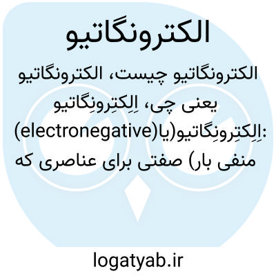 (یا: منفی بار) صفتی برای عناصری که تمایل به دست آوردن الکترون و تبدیل شدن بغه یون منفی دارند. هالوژن ها نمونه های نوعی عناصر الکترونگاتیوند. مثلاً در کلرید هیدروژن، اتم کُلُر بسیار الکترونگاتیوتر از هیدروژن است. در این حالت مولکول قطبی می شود و بار منفی در سمت اتم کُلُر قرار می گیرد. راه های متفاوتی برای تعیین میزان الکترونگاتیویتۀ عناصر وجود دارد (← الکترونگاتیویته). بنا به روش الکترونگاتیویتۀ مالیکن، این میزان از فرمول(فرمول ۱)محاسبه می شود.فرمول ۱: