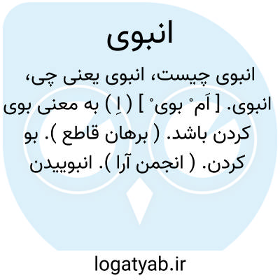 انبوی. [ اَم ْ بوی ْ ] ( اِ ) به معنی بوی کردن باشد. ( برهان قاطع ). بو کردن. ( انجمن آرا ). انبوییدن. ( ناظم الاطباء ). || ( ص ) چیزی را گویند که ببوی آمده و گندیده باشد. ( برهان قاطع ) ( از ناظم الاطباء ). بوی گرفته بود. ( لغت فرس اسدی چ اقبال ص 520 ). بوی ناک چیزی باشد. ( حاشیه فرهنگ اسدی نخجوانی ). بوی گرفته. ( صحاح الفرس از یادداشت مؤلف ) ( فرهنگ اوبهی ). گندیده. ( انجمن آرا ). چیزی که بدبو باشد. ( فرهنگ فارسی معین ). || ( اِ ) مطلق بوی را نیز گویند. ( برهان قاطع ). مطلق بوی خواه بوی خوب ویا بد. ( ناظم الاطباء ). || ( ص ) بوی دهنده ( خوب یا بد ). ( فرهنگ فارسی معین ). هر آنچه بوی افشاند. ( ناظم الاطباء ). || بوی کننده را گویند که فاعل باشد. ( از برهان قاطع ). در ترکیب بجای انبوینده آید. دست انبوی، زردانبوی، گل انبوی. ( فرهنگ فارسی معین ). || ( فعل )امر به معنی بوی کردن هم هست یعنی بوی کن و ببوی. ( از برهان قاطع ). رجوع به انبوهیدن و انبوییدن شود.