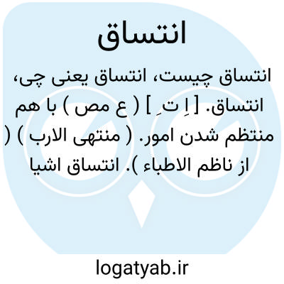 انتساق. [ اِ ت ِ ] ( ع مص ) با هم منتظم شدن امور. ( منتهی الارب ) ( از ناظم الاطباء ). انتساق اشیا؛ انتظام بعضی با بعضی. ( از اقرب الموارد ). نظم پذیرفتن. منظم گردیدن. مرتب شدن. ( فرهنگ فارسی معین ). طریق و انتظام پذیرفتن. ( غیاث اللغات ) ( آنندراج ). || روش و دستور چیزی ترتیب دادن. ( غیاث اللغات ) ( آنندراج ). نظم دادن. ترتیب دادن. ( فرهنگ فارسی معین ).