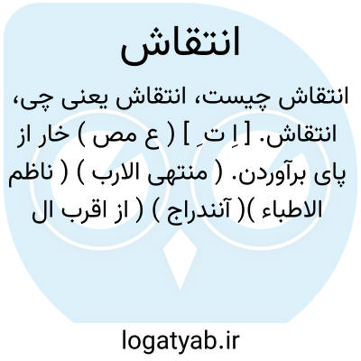 انتقاش. [ اِ ت ِ ] ( ع مص ) خار از پای برآوردن. ( منتهی الارب ) ( ناظم الاطباء )( آنندراج ) ( از اقرب الموارد ). خار از تن بیرون کردن. ( تاج المصادر بیهقی ) ( مصادر زوزنی ). || بر نگین نقش کردن فرمودن نقاش را. ( منتهی الارب ) ( ناظم الاطباء ) ( آنندراج ). فرمان دادن بنقاش که در نگین نقش زند. ( از اقرب الموارد ). || پای بر زمین زدن شتر که در آن خار درآمده باشد. ( منتهی الارب ) ( ناظم الاطباء ) ( آنندراج ). پای بر زمین زدن شتر بخاطر چیزی که در آن داخل شده است. ( از اقرب الموارد ). و منه قولهم لطمه لطمة المنتقش. ( منتهی الارب ) ( از ناظم الاطباء ) ( از اقرب الموارد ). || بیرون آوردن. ( منتهی الارب ) ( آنندراج ) ( ناظم الاطباء ). استخراج. ( از اقرب الموارد ): و یعتقدون أن نفس الاَّدمی تبقی ان کانت عارفة باﷲ و بملائکته منقشة بالحقایق، و لها درجة انتقاش الحقایق. ( حکمت اشراق ص 270 ). || برگزیدن چیزی را. ( منتهی الارب ) ( ناظم الاطباء ) ( آنندراج ) ( از اقرب الموارد ). || ازمعنی اول استعاره شده است برای توبه و جبران گناه چنانکه در قول حریری است: «هلکت یا مسکین او تنتقش ». || تمام حق خود را از کسی گرفتن. || برای خود خدمتکاری گرفتن. ( از اقرب الموارد ).