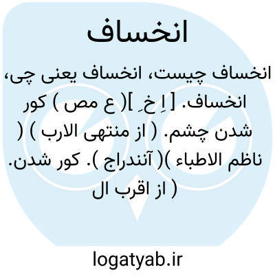 انخساف. [ اِ خ ِ ]( ع مص ) کور شدن چشم. ( از منتهی الارب ) ( ناظم الاطباء )( آنندراج ). کور شدن. ( از اقرب الموارد ). یقال: انخسفت العین. ( از منتهی الارب ) ( ناظم الاطباء ). || بزمین فرو رفتن. ( تاج المصادر بیهقی ) ( از اقرب الموارد ). || پوشیده شدن. ( آنندراج ). ناپدید شدن. گرفته شدن. ( فرهنگ فارسی معین ). || گرفته شدن ماه و آفتاب. ( آنندراج ). گرفتن ماه. ( فرهنگ فارسی معین ). خسوف. خسف. || ( اِمص ) گرفتگی ماه. ( فرهنگ فارسی معین ). و رجوع به خسوف شود.
