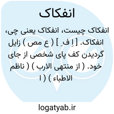 انفکاک. [ اِ ف ِ ] ( ع مص ) زایل گردیدن کف پای شخصی از جای خود. ( از منتهی الارب ) ( ناظم الاطباء ) ( از آنندراج ). زایل گردیدن پای از جای خود. ( از اقرب الموارد ). از جای بشدن عضو. ( تاج المصادر بیهقی ). از بند بیرون آمدن استخوان. از جادررفتن. دررفتگی. ( یادداشت مؤلف ). یقال انفکت قدمه. ( از منتهی الارب ) ( ناظم الاطباء ). || گشاده شدن میان انگشتان. ( منتهی الارب ) ( ناظم الاطباء ) ( آنندراج ). گشاده شدن انگشتان. ( از اقرب الموارد ). || از هم جدا گردیدن. ( منتهی الارب ) ( ناظم الاطباء ). از هم جدا شدن. ( غیاث اللغات ) ( آنندراج ). انفصال. ( از اقرب الموارد ). جدا شدن. ( ترجمان القرآن جرجانی ). || آزاد گشتن. ( منتهی الارب ) ( ناظم الاطباء ). آزاد شدن. ( غیاث اللغات ) ( آنندراج ) ( ترجمان القرآن جرجانی ) ( از اقرب الموارد ). یقال انفکت رقبة فلان من الرق. || ماانفک فلان قائماً؛ ای مازال. ( منتهی الارب ) ( ناظم الاطباء ). در این معنی از افعال ناقصه و ملازم نفی است. ( از اقرب الموارد ). || ( اِمص ) از هم جداشدگی. جدایی. ( ناظم الاطباء ).