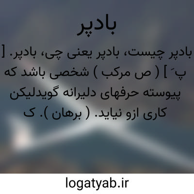 بادپر. [ پ َ ] ( ص مرکب ) شخصی باشد که پیوسته حرفهای دلیرانه گویدلیکن کاری ازو نیاید. ( برهان ). کسی که بر خود فخر کند و چیزی که در وی نباشد ادعا کند. ( ناظم الاطباء ). رجوع به بادبر و بادپران شود. || ( اِ مرکب )چوبی را گویند که سر آن از دیوار و عمارت بیرون باشد. || و بعضی چوبی را گفته اند که دو سر آن در دو دیوار عمارت نصب کنند. ( برهان ) ( ناظم الاطباء ). || چوبکی باشد که طفلان ریسمانی بر آن پیچند و از دست گذارند تا در زمین گردان شود. ( برهان ).دُوّامه. ( منتهی الارب ). رجوع به دوامه شود، بمعنی بادفر. ( برهان جامع ). || کاغذ باد باشد. ( سروری ). رجوع به بادبرک و بادپرک و بادبر و بادفر و فرفره و بادآفراه و بادافره و بادفر و بادبیزن شود.