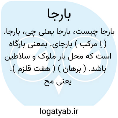بارجا. ( اِ مرکب ) بارجای. بمعنی بارگاه است که محل بار ملوک و سلاطین باشد. ( برهان ) ( هفت قلزم ). یعنی محل بار ملوک که بارگاه نیز گویند. مثالش امیرخسرو فرماید: