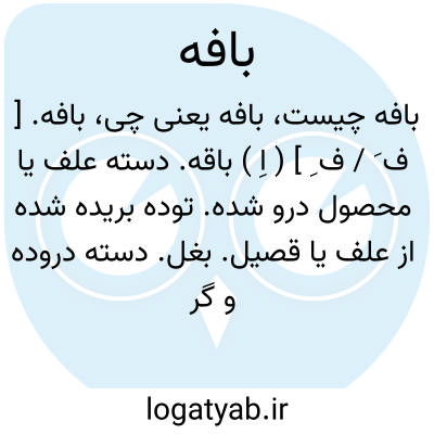 بافه. [ ف َ / ف ِ ] ( اِ ) باقه. دسته علف یا محصول درو شده. توده بریده شده از علف یا قصیل. بغل. دسته دروده و گرد کرده از یونجه و گندم و جو و غیرآن. ( این کلمه در چهار محال بختیاری و دهات کرمان بدین معنی بکار میرود ). || دسته تره. ( مهذب الاسماء ). و رجوع به بافه شود.