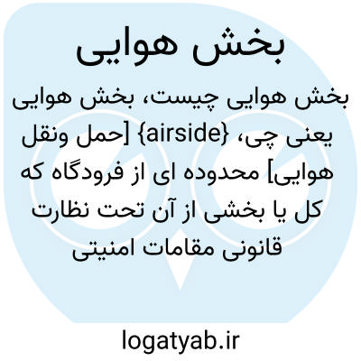 {airside} [حمل ونقل هوایی] محدوده ای از فرودگاه که کل یا بخشی از آن تحت نظارت قانونی مقامات امنیتی دولتی است و فقط مسافران و افراد مجاز می توانند به آن وارد شوند