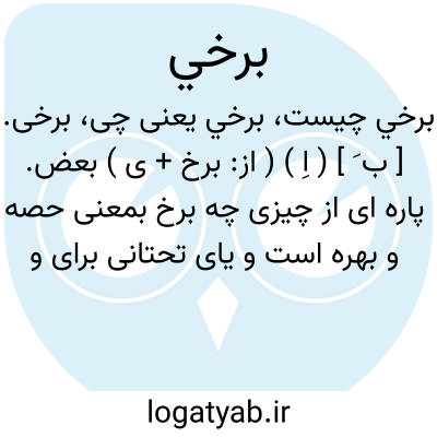 برخی. [ ب َ ] ( اِ ) ( از: برخ + ی ) بعض. پاره ای از چیزی چه برخ بمعنی حصه و بهره است و یای تحتانی برای وحدت، لهذا بمعنی اندکی مشهور است. ( مهذب الاسماء ). قدری. بعضی. پاره و حصه. جزوی. بخشی. لختی. بهره. اندکی از بسیار. ( برهان ). و رجوع به برخ شود.