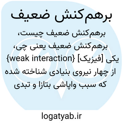 {weak interaction} [فیزیک] یکی از چهار نیروی بنیادی شناخته شده که سبب واپاشی بتازا و تبدیل نوترون به پروتون در هسته می شود