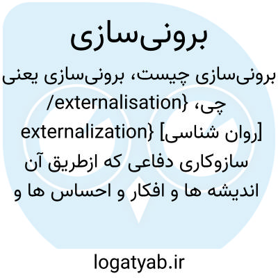 {externalisation/ externalization} [روان شناسی] سازوکاری دفاعی که ازطریق آن اندیشه ها و افکار و احساس ها و ادراک ها به جهان بیرون نسبت داده میشود