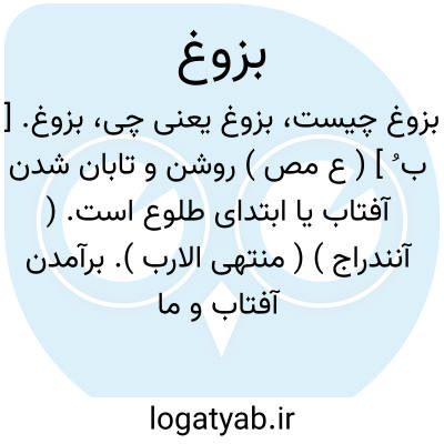 بزوغ. [ ب ُ ] ( ع مص ) روشن و تابان شدن آفتاب یا ابتدای طلوع است. ( آنندراج ) ( منتهی الارب ). برآمدن آفتاب و ماه و ستاره. ( شرفنامه منیری ) ( ناظم الاطباء ). برآمدن آفتاب و ماه. ( المصادر زوزنی ). تیغزدن آفتاب. طلوع. ( یادداشت بخط دهخدا ):