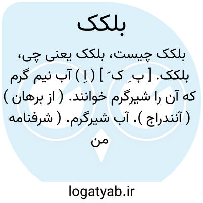 بلکک. [ ب ِ ک َ ] ( اِ ) آب نیم گرم که آن را شیرگرم خوانند. ( از برهان ) ( آنندراج ). آب شیرگرم. ( شرفنامه منیری ). بِلکَل. و رجوع به بلکل شود.