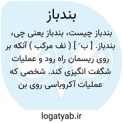 بندباز. [ ب َ ] ( نف مرکب ) آنکه بر روی ریسمان راه رود و عملیات شگفت انگیزی کند. شخصی که عملیات آکروباسی روی بند انجام دهد. ریسمان باز. ( فرهنگ فارسی معین ). رسن باز. آنکه بر طناب وبندی در هوا کشیده رود و اعمال غریبه بر بند کند.