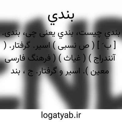 بندی. [ ب َ ] ( ص نسبی ) اسیر. گرفتار. ( آنندراج ) ( غیاث ) ( فرهنگ فارسی معین ). اسیر و گرفتار. ج، بندیان. ( ناظم الاطباء ). اسیر. ( ترجمان القرآن ). زندانی. ج، بندیان. ( فرهنگ فارسی معین ). محبوس. مسجون. مغلول:
