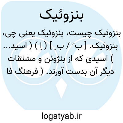 بنزوئیک. [ ب َ / ب ِ ] ( اِ ) ( اسید... ) اسیدی که از بنژوئن و مشتقات دیگر آن بدست آورند. ( فرهنگ فارسی معین ).