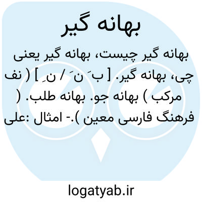 بهانه گیر. [ ب َ ن َ / ن ِ ] ( نف مرکب ) بهانه جو. بهانه طلب. ( فرهنگ فارسی معین ).