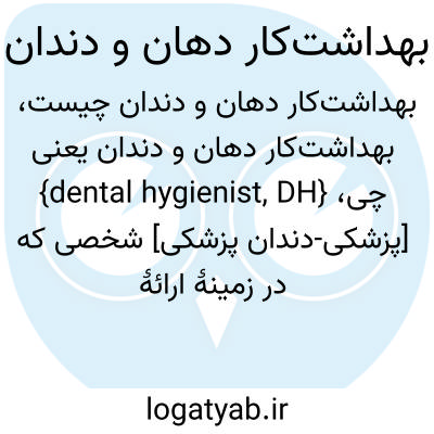 {dental hygienist, DH} [پزشکی-دندان پزشکی] شخصی که در زمینۀ ارائۀ خدمات بهداشتی دندان پزشکی آموزش رسمی دیده و وظیفۀ او عمدتاً آموزش بهداشت دهان و دندان و جِرم گیری و پرتونگاری و اقدامات پیشگیرانه برای مهار بیماری های دهان و دندان است