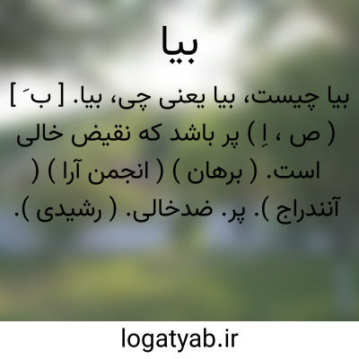 بیا. [ ب َ ] ( ص، اِ ) پر باشد که نقیض خالی است. ( برهان ) ( انجمن آرا ) ( آنندراج ). پر. ضدخالی. ( رشیدی ). پر. نقیض خالی. ( ناظم الاطباء ). || در خانه و در سرا. ( برهان ) ( ناظم الاطباء ). در خانه. ( انجمن آرا ) ( آنندراج ). رجوع به بیا شود.