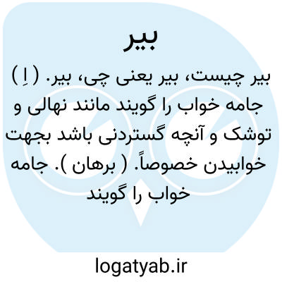 بیر. ( اِ ) جامه خواب را گویند مانند نهالی و توشک و آنچه گستردنی باشد بجهت خوابیدن خصوصاً. ( برهان ). جامه خواب را گویند مانند نهالی و تشک و غیره و بیری بمعنی گستردنی بود. ( فرهنگ جهانگیری ). جامه خواب مانند لحاف و نهالی و غیره بیری مانند گستردنی. ( رشیدی ). جامه خواب است مانند نهالی و تشک و آنچه گستردنی باشد. ( انجمن آرا ) ( آنندراج ). جامه خواب مانند نهالی و توشک و آنچه گستردنی باشد جهت خوابیدن. ( ناظم الاطباء ):